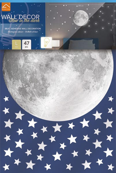 Note: Questa decorazione fosforescente è facile da applicare così come da rimuovere. Può essere applicata su pareti o su qualunque altra superficie liscia e pulita. E' realizzata in Vinile senza ftalati non tossico e adesivo acrilico a base d'acqua. La decorazione brilla al buio se precedentemente esposta a luce artificiale.