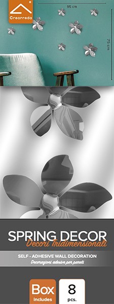Note: Le silhouette da parete “Spring Decor” sono degli elementi decorativi grafici, originali e 3D. Le sagome si possono disporre a piacere, seguendo la propria immaginazione, per decorare con un tocco giocoso qualsiasi ambiente. Ogni sagoma si applica facilmente sulla parete tramite un piccolo supporto originale 3M in plastica adesivo e removibile, incluso nella confezione. Il packaging, elegante e ricco, rende gli “Spring Decor” un perfetto articolo da regalo per qualunque occasione.